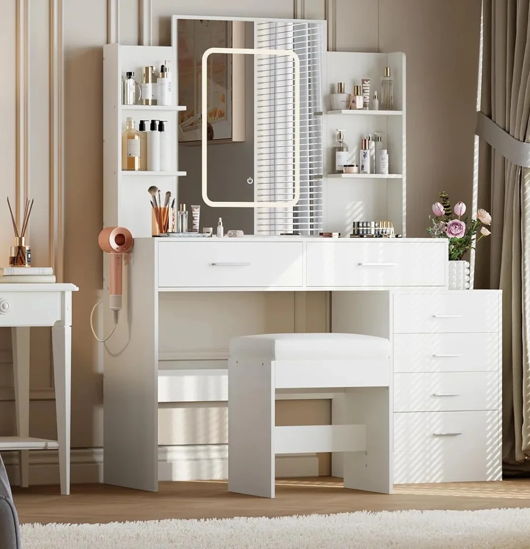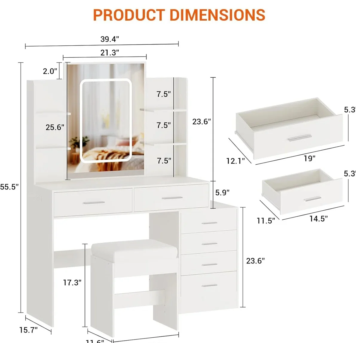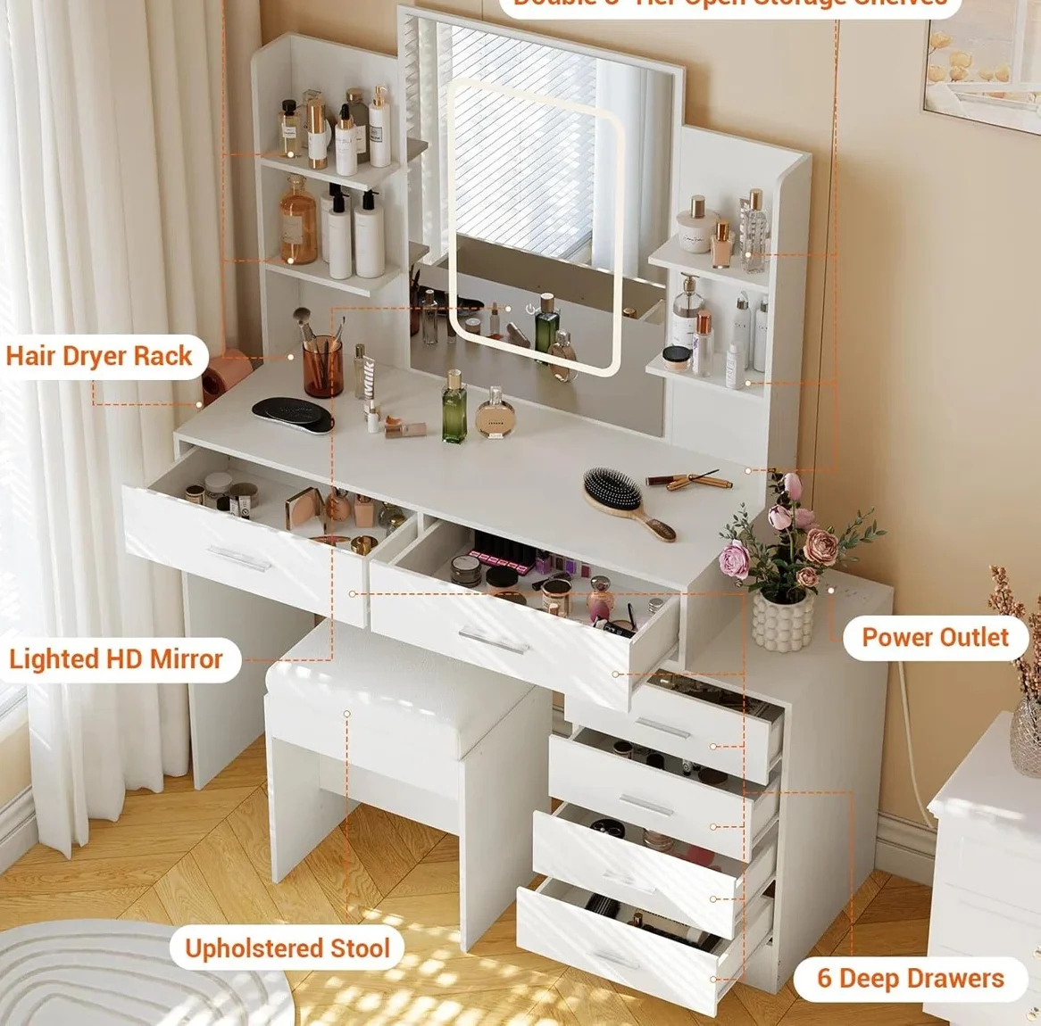 Equipped with drawers and compartments, the table offers plenty of storage for cosmetics, jewelry, and personal accessories. You can easily organize items to keep your vanity clutter-free. In addition, the smooth sliding drawers provide quick access while maintaining a clean and modern look.